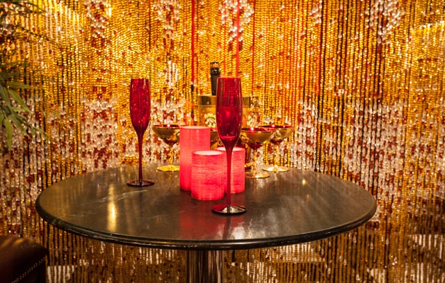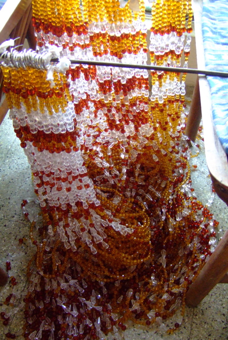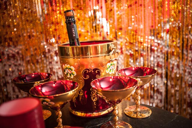 Here we have used various shapes of acrylic crystal beads all the while in keeping with the prominent color theme champagne in order to stay true to the essence of this space. Not only do the bead curtains here lend a sense of richness, warmth, royalty & depth, but they also help segregate the area from the larger museum creating a sense of privacy.