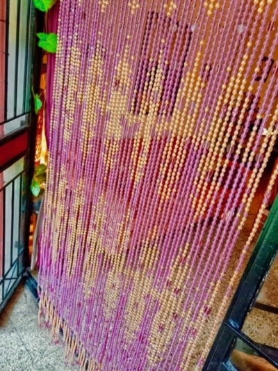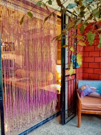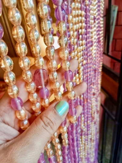 Best Restaurant Partition Screen Interior Design – Golden Peach & Butter Pink Glass Beaded Curtain is part of our limited edition Ready-Made Collection. A sophisticated glass bead curtain by Memories of a Butterfly, is a high-end bead curtain that would be a talking point of any home living room interior design, elevating restaurant interior styling, Spa interior partitions and hotel receptions.