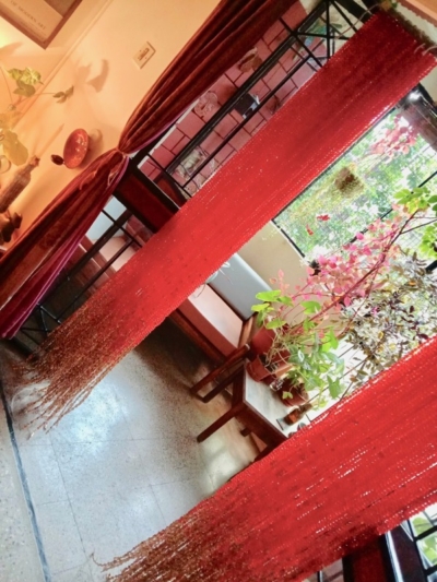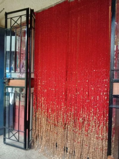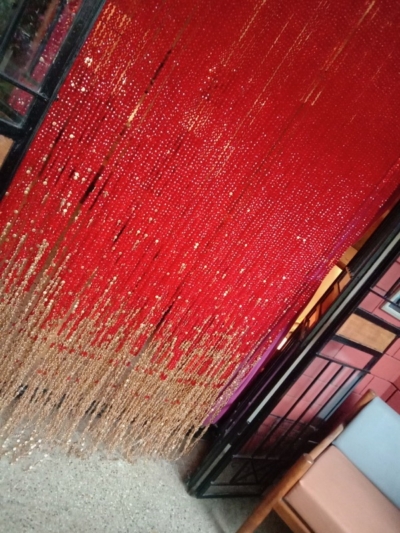 There are various shades of reds that you can choose form to make this same bead curtain design. We can custom color the material to the needs of your Space aesthetics.
