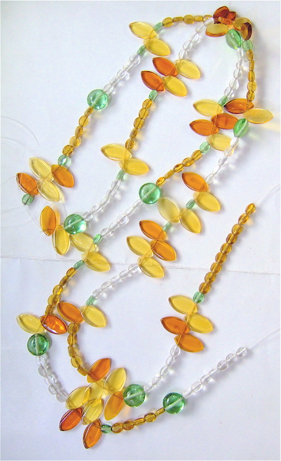 This Bead curtain is detailed with multiple yellow and champagne hues in small oval transparent glass beads accented with similar shades of leaf cut glass beads, interspersed between clusters of leaf beads are chunkier batasa shape light sea green glass beads.