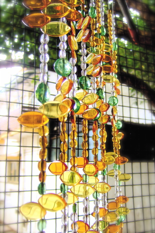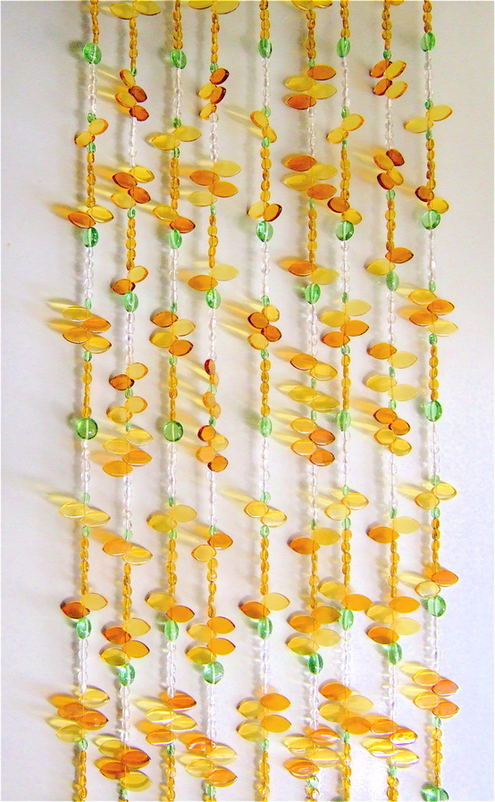 The Yellow Leaf Bead Curtain was created as dining kitchen separator, partitions, room divider, where the adjacent wall to the bead curtain is a bright yellow. The bead curtain not only accentuated the yellow in the area but also broke the monotony by bringing in a subtle contrast by introducing light sea blue and some white.